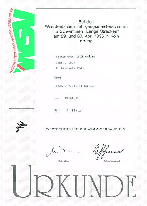 Veröffentlicht am 30. April 199516. Oktober 2025 von MKWestdeutsche Meisterschaften 1995 | Köln Datum29. bis 30. April 1995OrtBundesleistungszentrum Köln | 50m BahnWettkampfWestdeutsche Meisterschaften | Lange Strecken 9:04,85 min.800m Freistil6. PlatzAltersklasse: offen 17:09,23 min.1500m Freistil2. PlatzWestdeutscher VizemeisterAltersklasse: 16 5:08,28 min.400m LagenAltersklasse: 16